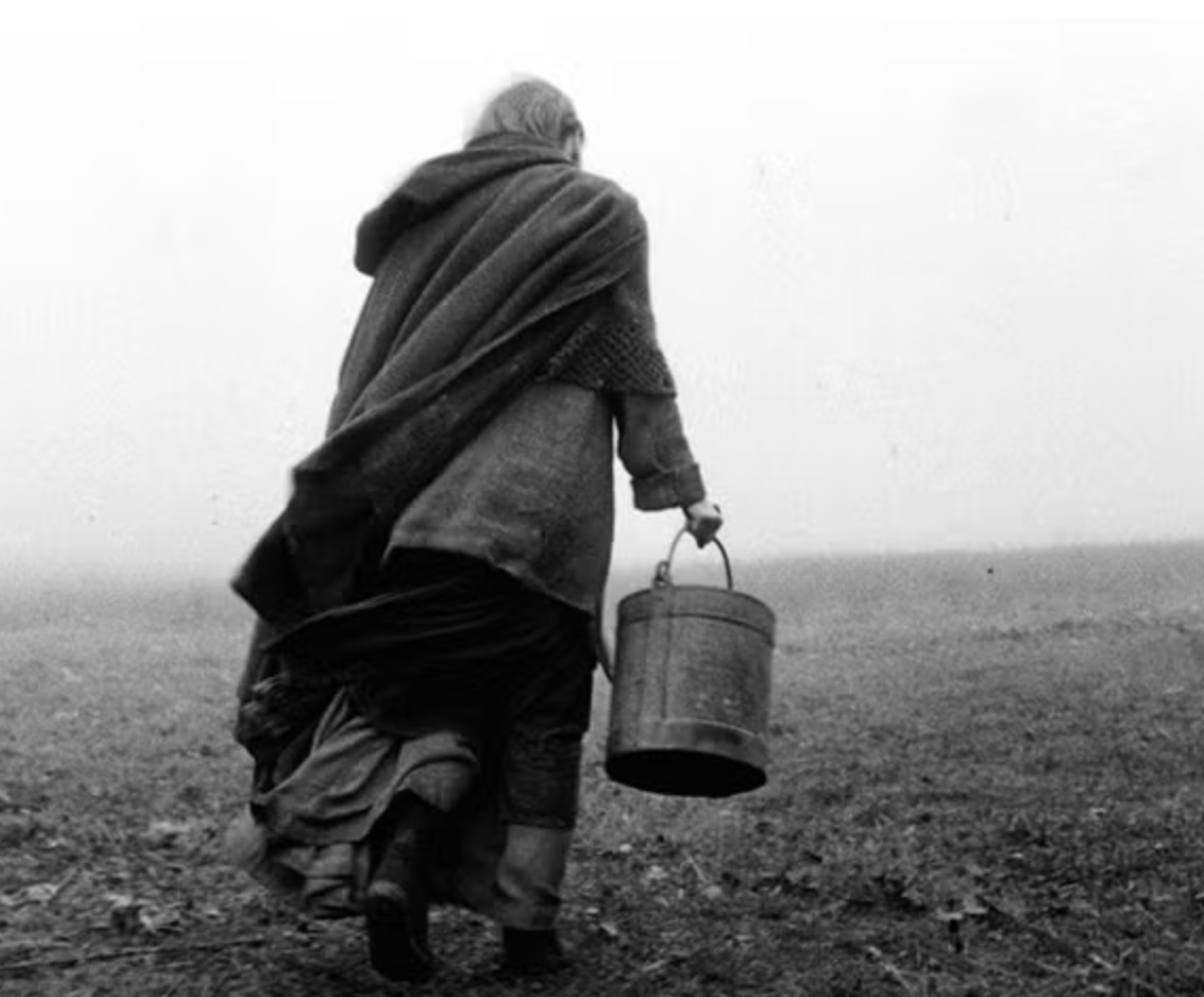Veamos, por ejemplo, una de las más bellas escenas, la del día cuarto (minuto 118’) en que padre e hija han decidido partir y arrastran la pesada carreta colina arriba. Arriba un solitario árbol espera a los viajeros, agitado por el viento inmisericorde. La toma evoca aquella otra toma famosa que uso Bergman en el Séptimo Sello, para mostrarnos la fila de los condenados. El camino es agotador, se oye el chirrido de las ruedas; la cámara —casi fija, realizando un zoom casi imperceptible-— desde la distancia, los observa luchar contra el viento; aparecen y desaparecen como si hubieran visto algo al otro lado —¿la destrucción, el juicio final, Armagedón?-—. La pareja inicia el camino de regreso, sumida en una desolación, si cabe, aún mayor. El suplicio es la espera, la circularidad, la imposibilidad de escapar. En este purgatorio, los seres están condenados a emprender cada jornada como si aún participarán de la idea de que existe otra forma de vida.